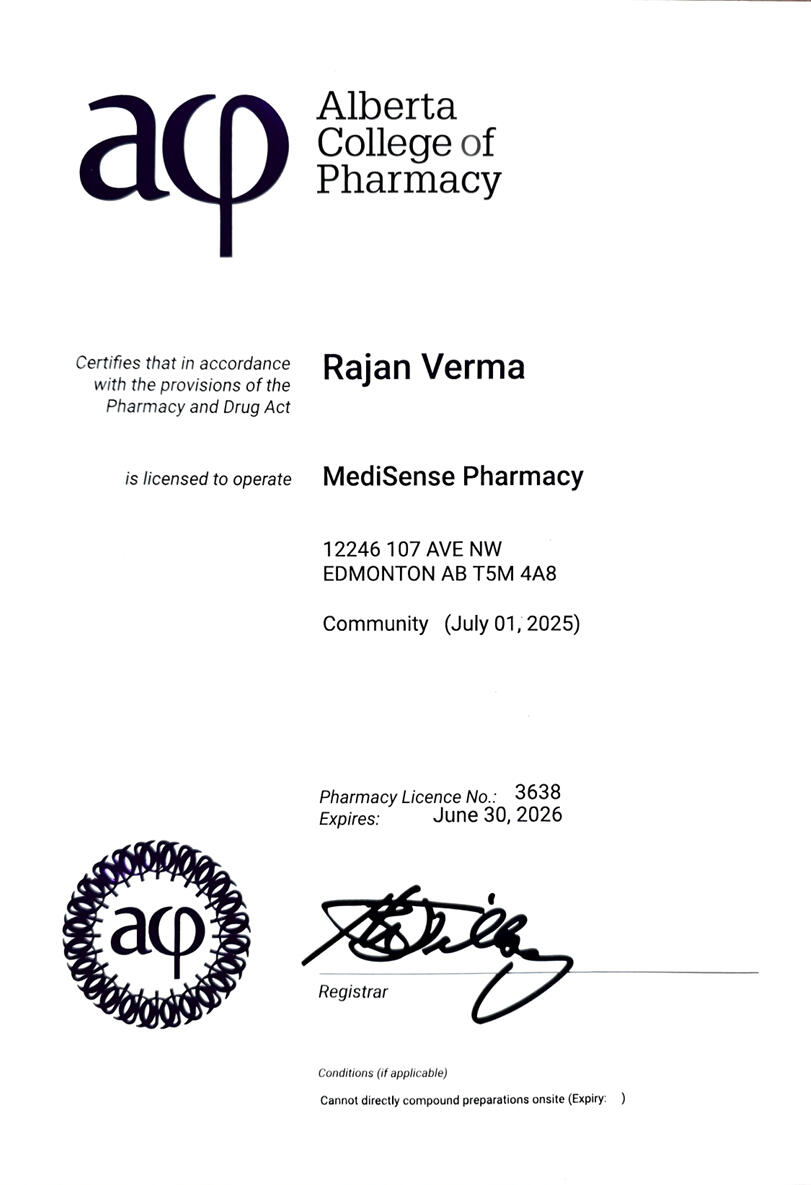 At MediSense Pharmacy, we’re more than just a place to fill prescriptions, we’re your dedicated partner in health. Proudly serving the Edmonton community, our independent pharmacy is built on a commitment to personalized care, expert guidance, and accessible healthcare services tailored to your unique needs.Our knowledgeable team takes the time to listen, understand, and support you, whether you need help managing a chronic condition, selecting the right over-the-counter products, or navigating complex treatment options. With services like immunizations, medication reviews, custom home care solutions, and free prescription delivery, we make it easier for you to stay healthy and informed.We believe in care that is centered around you.